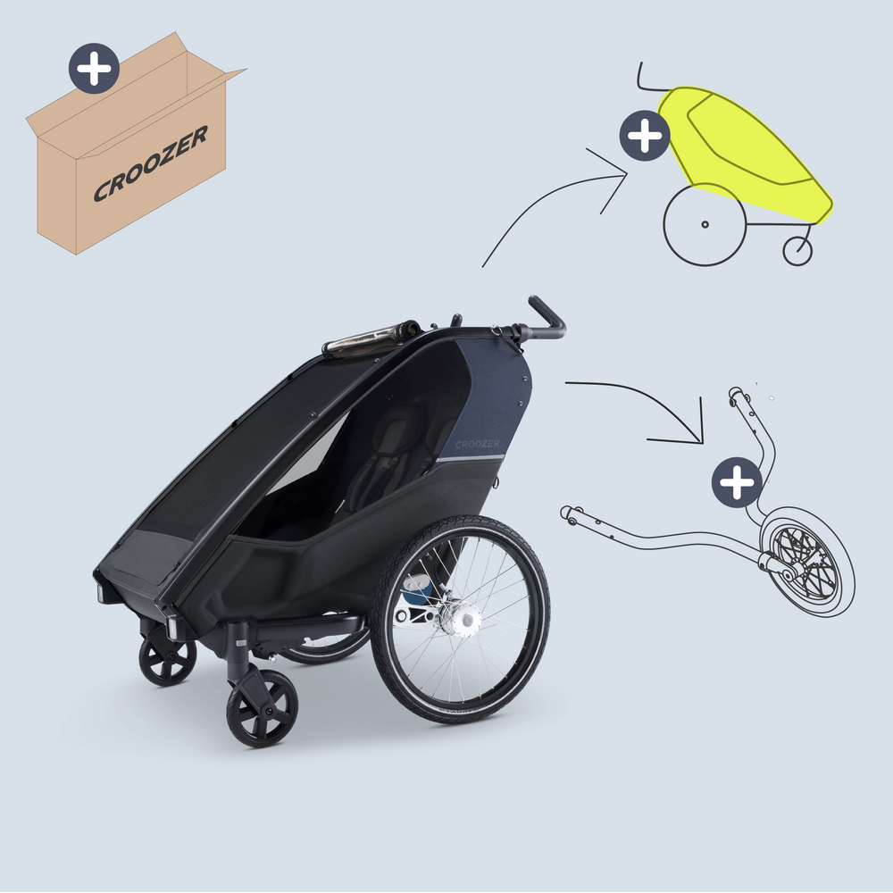 You can use Croozer Lykke in stroller, bike trailer and jogger mode. An absolute combination pram! The stroller and trailer sets are included in the package and the jogger set is available as an accessory. Lykke has the best solution for all everyday situations! You can even conveniently attach the hitch arm and stroller wheels to the trailer when you're not using them.